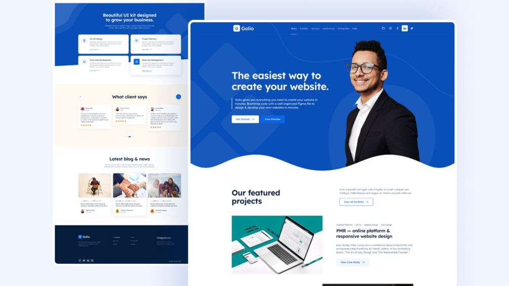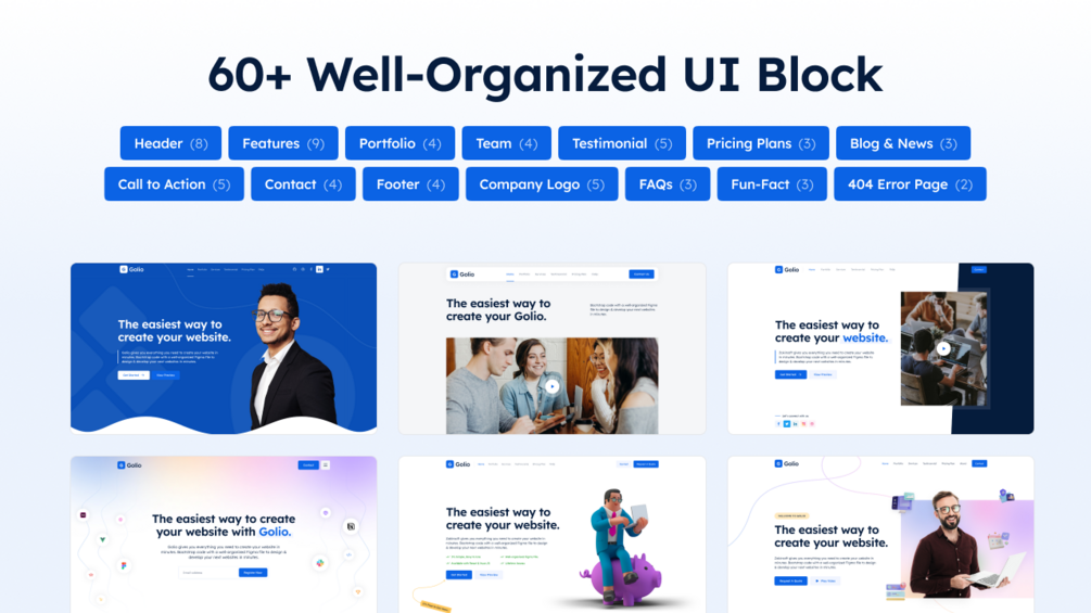 You'll get: Golio - Full UI Kit and Design System. That's include: Design Principle, Style Guide (Color, Typography, Grid, Iconography, Layout, spacing), 60+ UI Blocks, 4 Premade Templates, 200+ UI Components